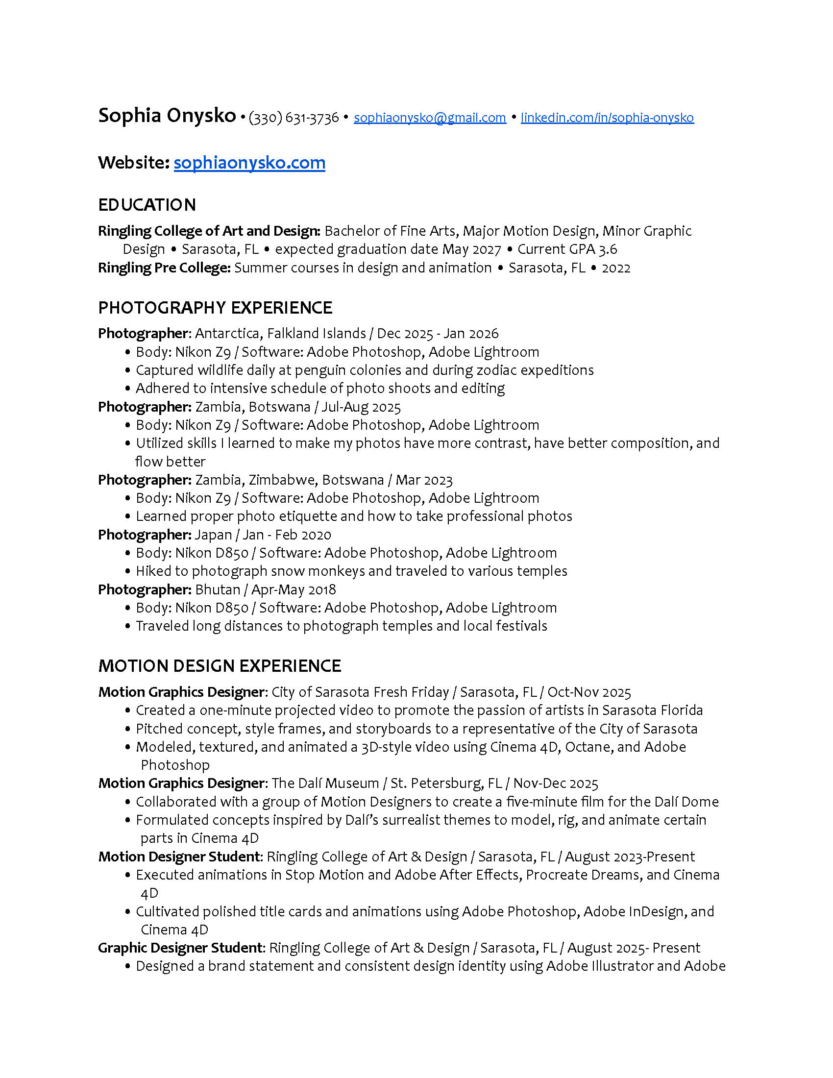 Hi! I’m Sophia. I am a Motion Design student at Ringling College of Art and Design. I grew up in Ohio but currently live in Florida. I enjoy making art that is plain in its imaging, but if you look closer there is usually a hidden meaning. I usually enjoy making my art in 3D with Cinema 4D, but I also enjoy using the adobe suite to create fun design and animations.When not doing art I enjoy playing with my dog and taking him for walks. I'm also an avid fan of reading novels, particularly ones filled with action. In addition to digital art, I enjoy traveling and photography, usually taking pictures of live animals.